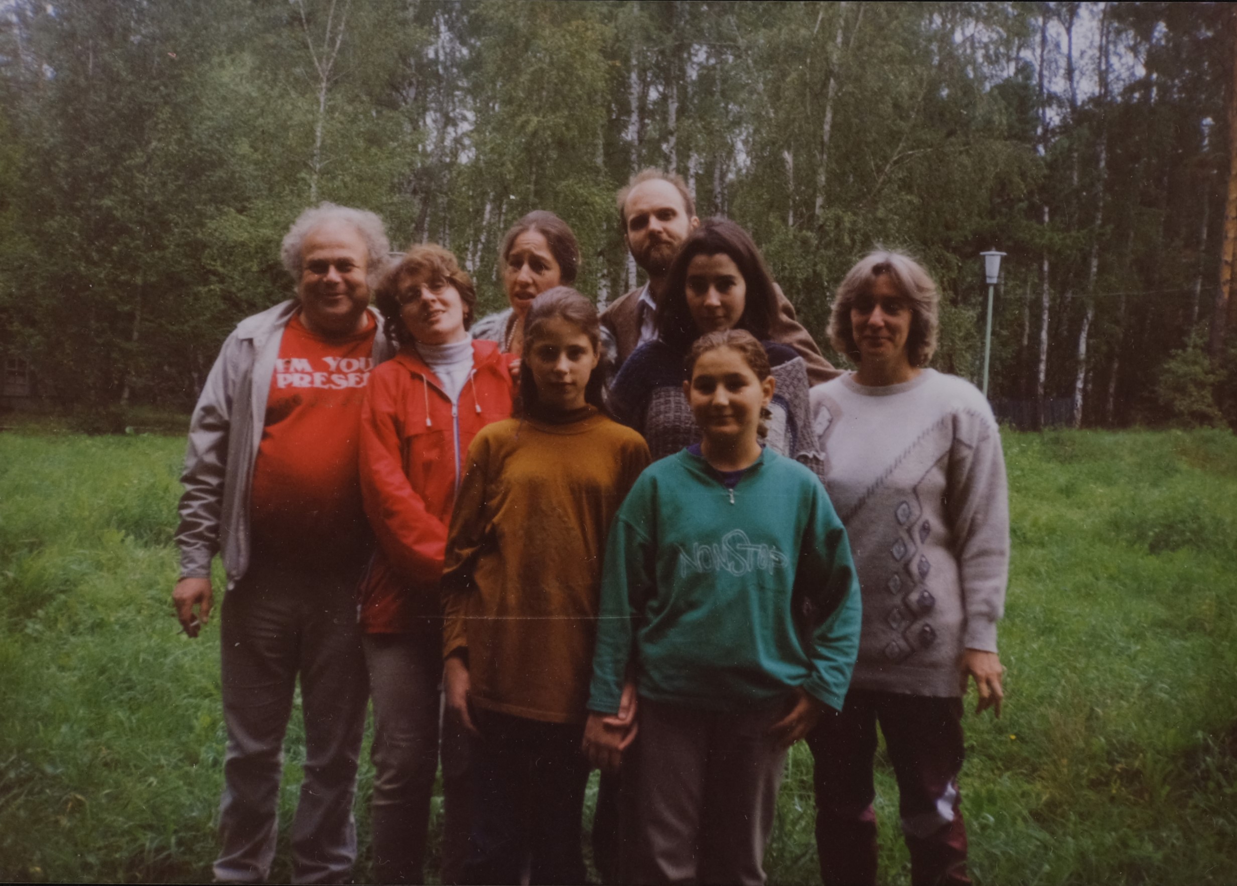 Cлева направо: в верхнем ряду Григорий Крейдлин, Елена Шмелева, Татьяна Янко, Алексей Шмелев, Наташа Нусинова, Елена Муравенко. Впереди Лиза Виноградова и неопознанная участница школы. Летняя лингвистическая школа в Ступино, 1994