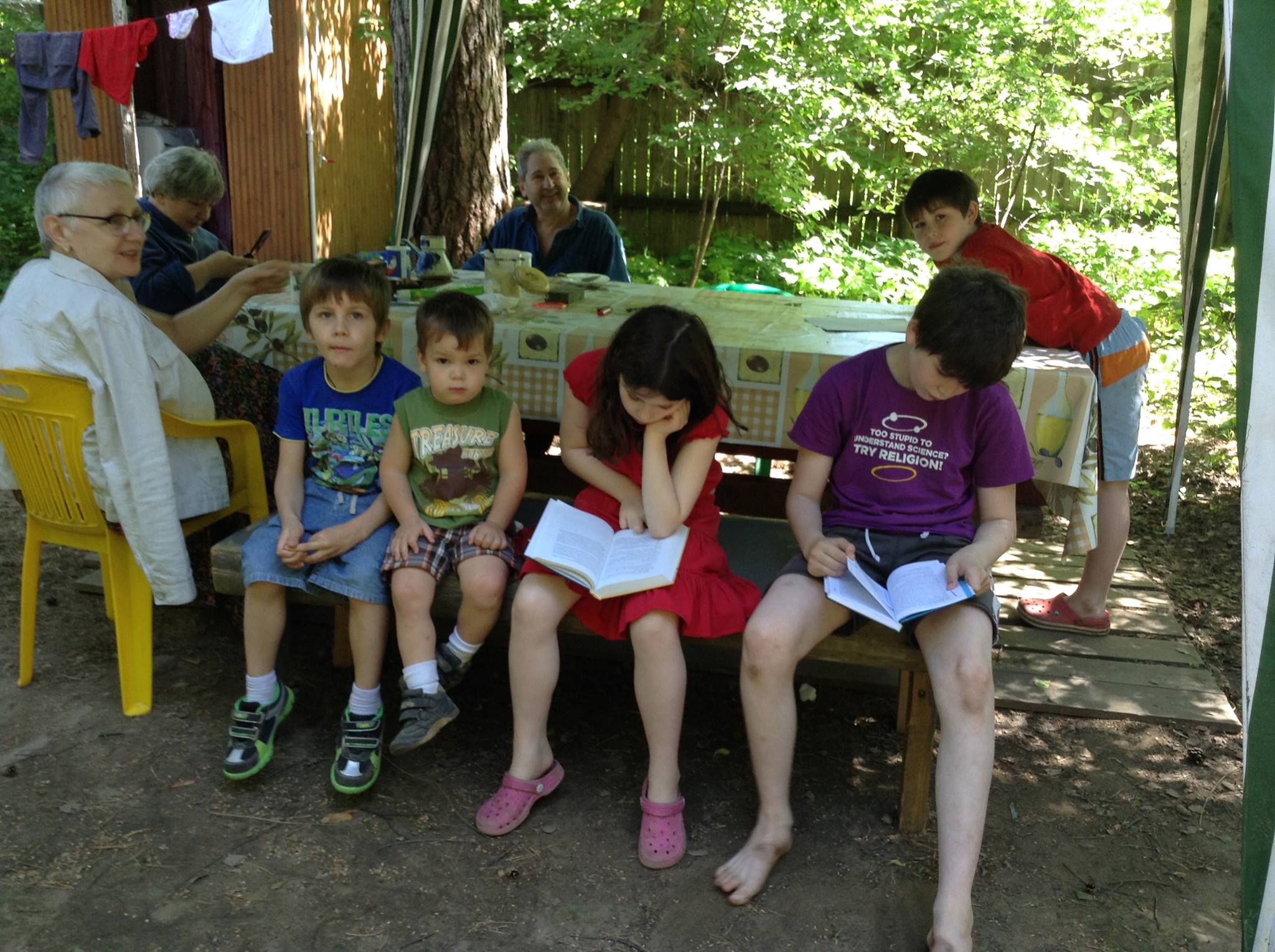 В первом ряду: Елена Шмелева, Ваня Шмелев, Руся Шмелев, Ира Шур, Петя Ширинский. Во втором ряду Елена Вигдорова, Даниил Шур, Гриша Ширинский. Малаховка, 2014