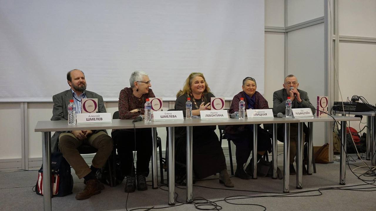 Слева направо: Алексей Шмелев, Елена Шмелева, Ирина Левонтина, Людмила Улицкая*, Лев Рубинштейн. Презентация книги Ирины Левонтиной, Москва, ярмарка Non/fiction, 2015 (*Признана Минюстом РФ иностранным агентом)