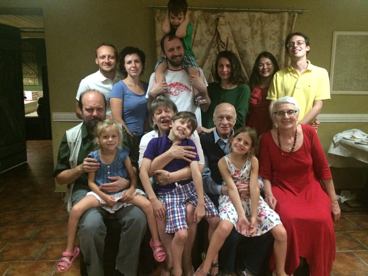 Стоят: Владимир Шмелев, Мария Шмелева, Александр Шмелев с сыном Русей на плечах, Светлана Шмелева, Галина Шмелева, Алексей Шмелев-мл. Сидят: Алексей Шмелев с внучкой Ирой, Наталья Ивановна Федоткина с правнуком Ваней, Яков Владимирович Эшкинд с правнучкой Асей, Елена Шмелева. День рождения Я. В. Эшкинда, Малаховка, 2016