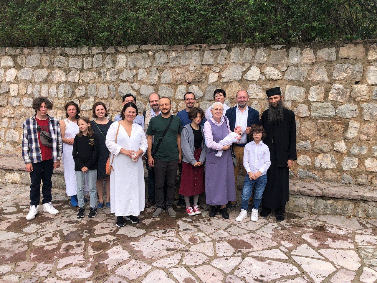 Слева направо: Ваня Шмелев, Светлана Шмелева, Ира Шмелева, Мария Шмелева, Иван Булатецкий, Галина Шмелева, Алексей Шмелев, Владимир Шмелев, Алексей Шмелев-мл., Ася Шмелева, Роза Булатецкая, Елена Шмелева с внуком Ильей на руках, Александр Шмелев, Руся Шмелев, о. Василий. Крестины Ильи в монастыре Подмайне, Будва, Черногория, 2022