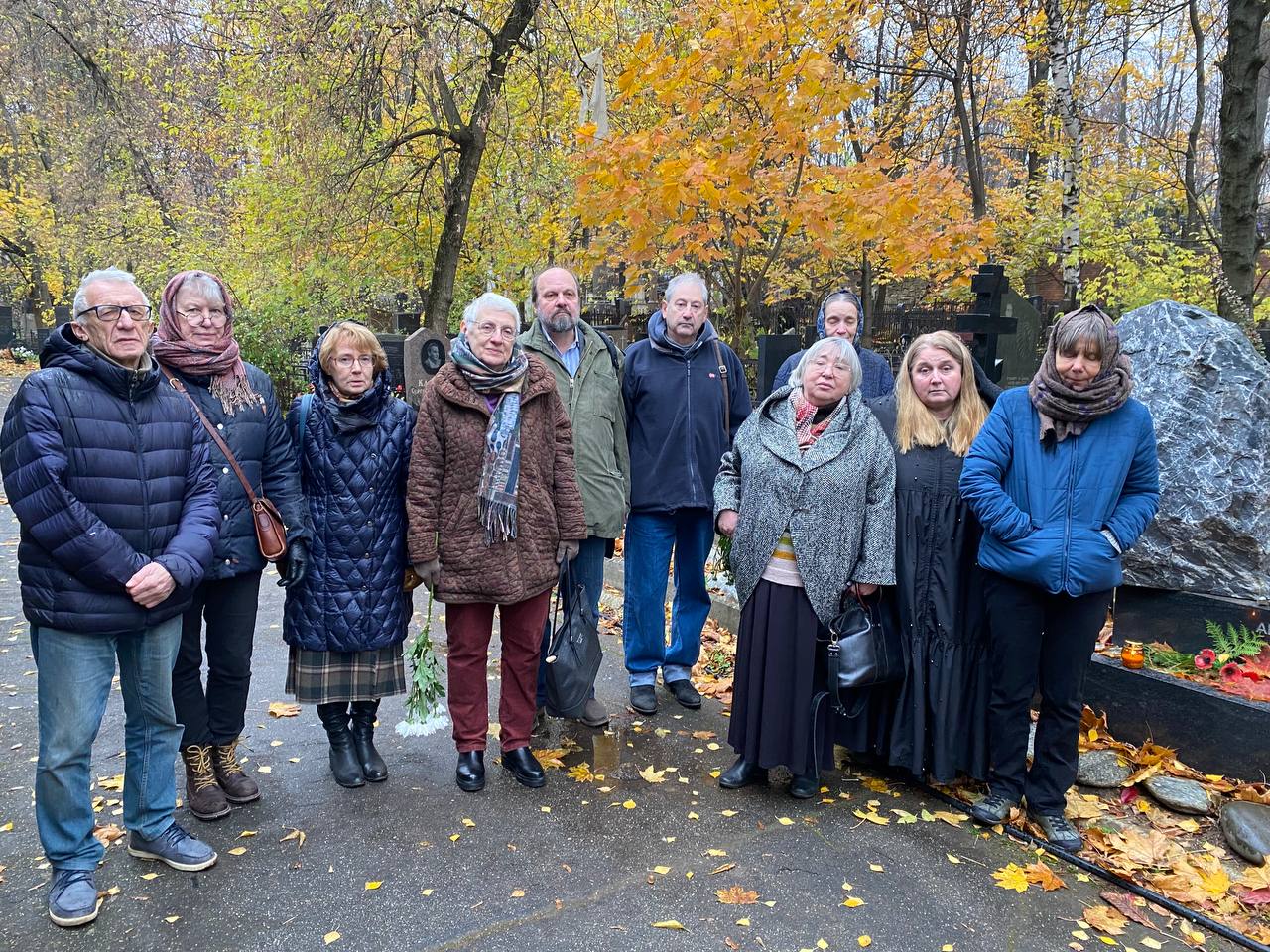 Слева направо: Валентин Гефтер, Наталья Дзядко, Наталья Гольдман, Елена Шмелева, Алексей Шмелев, Даниил Шур, Елена Вигдорова, Ирина Левонтина, Марина Поливанова. На заднем плане неизвестная женщина, примкнувшая к акции «Возвращение имен» у могилы Арсения Рогинского. Москва, Введенское кладбище, 2022