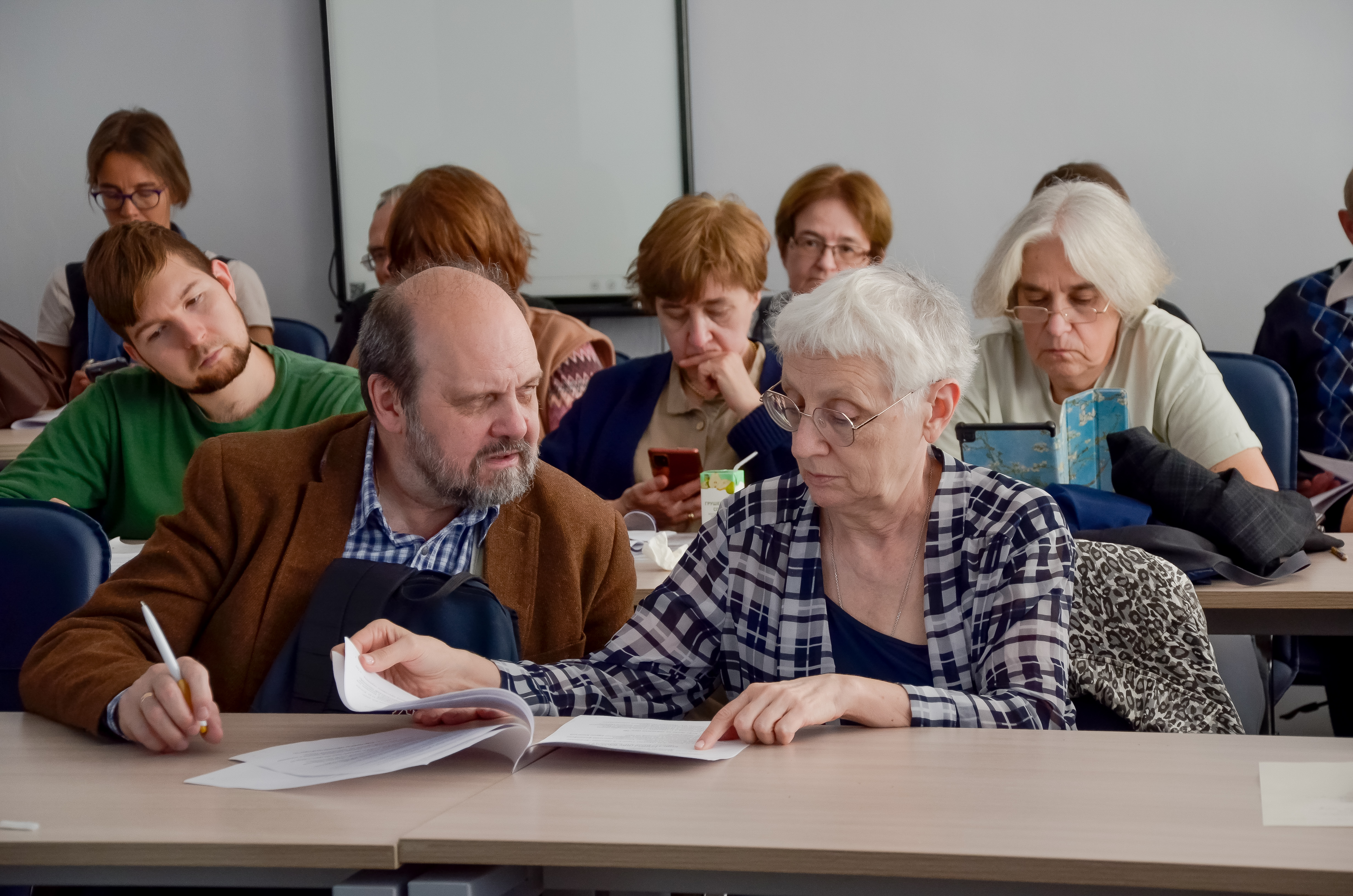 На переднем плане Алексей Шмелев и Елена Шмелева, за ними Татьяна Михайлова и Ирина Сурат, на заднем плане Анна Птенцова и Ирина Галактионова. Конференция “Маргиналии-2023: границы культуры и текста”, Арзамас, 2023