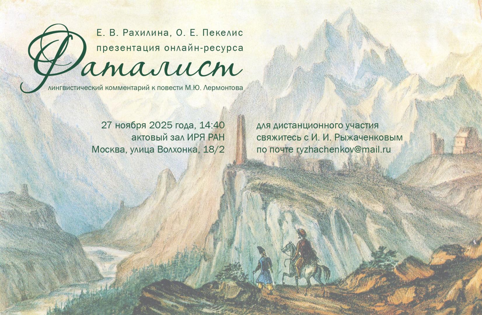 В четверг 27 ноября 2025 года в 14:40 на Ученом совете ИРЯ РАН будет представлен новый электронный ресурс — лингвистический комментарий к повести М. Ю. Лермонтова «Фаталист». Презентацию ресурса будет сопровождать доклад Екатерины Владимировны Рахилиной и Ольги Евгеньевны Пекелис. Для получения ссылки для участия через зум просьба обращаться к Ивану Игоревичу Рыжаченкову по почте ryzhachenkov@mail.ru.